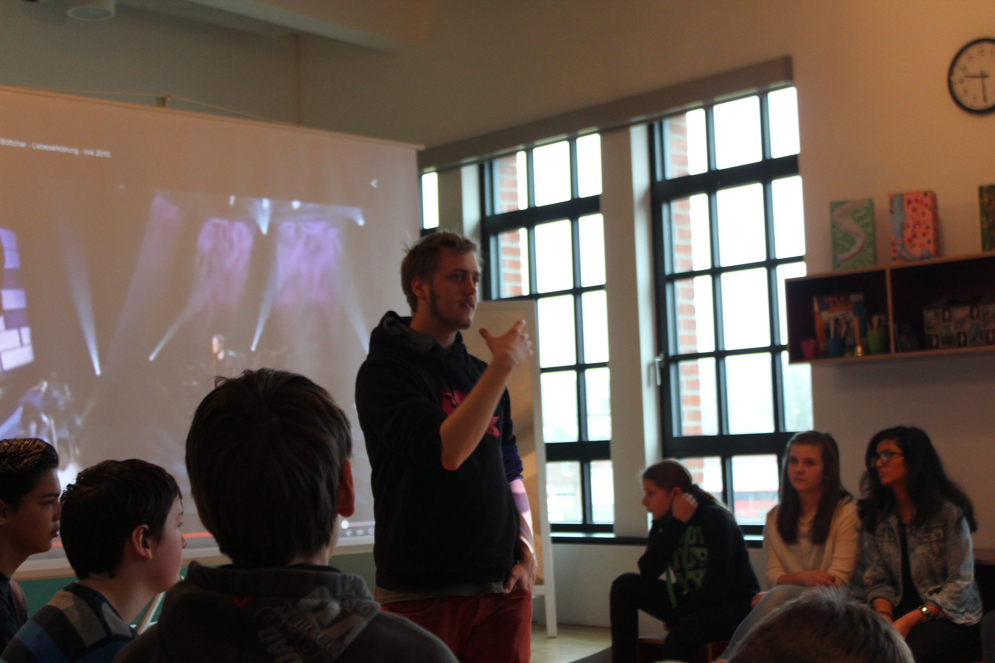 Nachdem die Klasse am Donnerstagmorgen im Duden-Studio des wortreich zu Beginn durch kurze Spiele, die nicht nur Spaß bringen, sondern auch die Konzentration, das Miteinander und die Kreativität fördern, auf das Thema eingestimmt wurden, bekamen sie unter anderem anhand verschiedener Videobeispiele einen Eindruck davon, was denn Slam-Poetry eigentlich ist. Als Einstieg zum eigenen kreativen Verfassen von Texten dienten verschiedene Übungen, bei denen die Schüler und Schülerinnen innerhalb weniger Minuten ein eigenes Gedicht schrieben und in Zweiergruppen fantasievolle Geschichten verfassten. Dabei durften ein Happy-End und der motivierende Applaus der Mitschüler natürlich nicht fehlen. Nach einer Poetry-Slam-Einlage des Slammers persönlich auf der Bühne des Duden-Studios ging es dann an die ersten Ideensammlungen für die eigenen Texte über individuelle Themen, die sich die Teilnehmer selbst ausdachten. In einem kurzen Beratungsgespräch stand Tilman Döring ihnen bei den ersten Entwürfen mit Rat und Tat zur Seite. Auch im Unterricht der achten Klasse wird der Workshop aufbereitet werden.
