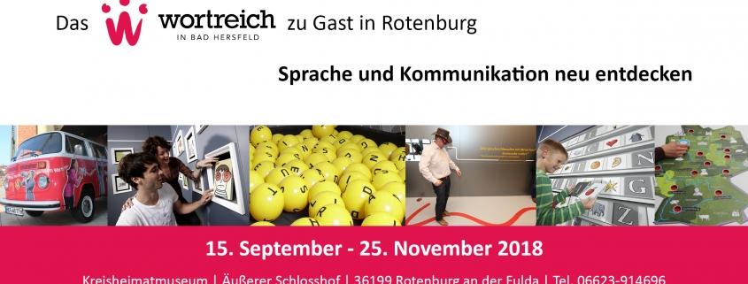 Vom 15. September bis zum 25. November 2018 ist das wortreich in Bad Hersfeld mit seiner Wanderausstellung zu den Themen Sprache und Kommunikation im Kreisheimatmuseum in Rotenburg zu Gast. Wie es sich für die Wissens- und Erlebniswelt für Sprache und Kommunikation gehört, werden zahlreiche Mitmach-Exponate für große und kleine Besucher präsentiert.