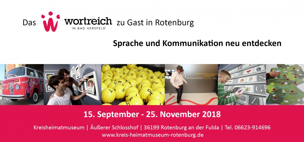 Vom 15. September bis zum 25. November 2018 ist das wortreich in Bad Hersfeld mit seiner Wanderausstellung zu den Themen Sprache und Kommunikation im Kreisheimatmuseum in Rotenburg zu Gast. Wie es sich für die Wissens- und Erlebniswelt für Sprache und Kommunikation gehört, werden zahlreiche Mitmach-Exponate für große und kleine Besucher präsentiert.