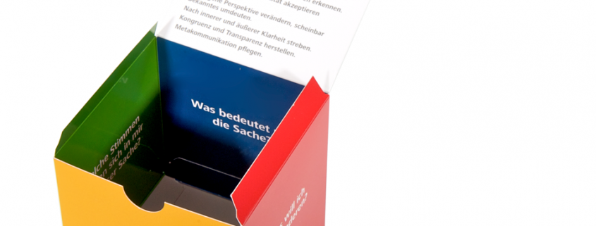 Eine Antwort darauf ist der VerständigungsWürfel. Er hilft, sich erst einmal selbst über die gegenwärtige Situation klar zu werden und zu definieren, was überhaupt die eigenen Vorstellungen sind. „Was ist jetzt meine Wahrheit der Situation?“ lautet der Ausgangspunkt und „Was ist jetzt meine Motivation für eine Verständigung?“. Jede Seite des Würfels führt Schritt für Schritt zur Gestaltung der bevorstehenden Aussprache mit dem Gesprächspartner, denn „Verständigung muss man wollen“. Am Ende steht natürlich die direkte Kommunikation. Probleme damit? Dann auf ins wortreich! Denn hier können Sie Kommunikation erfahren, Sprache erleben und im Anschluss daran, einen VerständigungsWürfel erwerben, damit Ihrer optimalen Kommunikation in Zukunft nichts mehr im Wege steht.