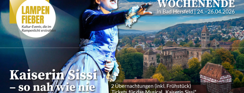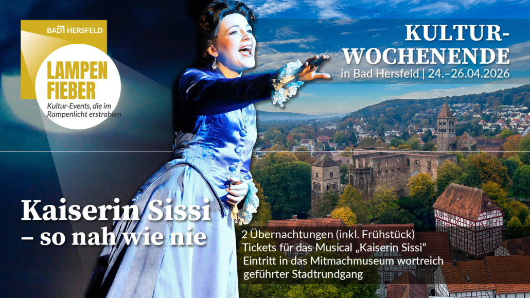 Erleben Sie ein stilvolles Kulturwochenende in der Festspielstadt Bad Hersfeld und tauchen Sie ein in die faszinierende Welt der Kaiserin Sissi. Das Pauschalangebot „Lampenfieber – Kaiserin Sissi“ verbindet Theatergenuss, Stadtgeschichte und entspannte Tage in besonderem Ambiente.